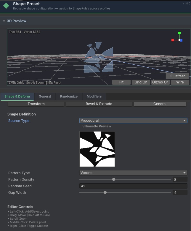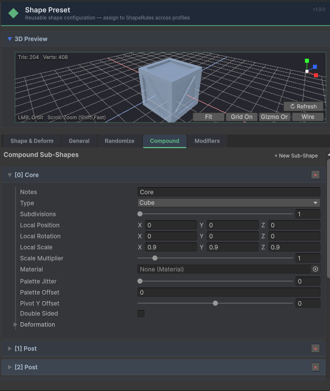 Shape Modifiers are procedural operations applied after the base mesh is generated but before it's placed. They can be stacked and reordered in any combination.