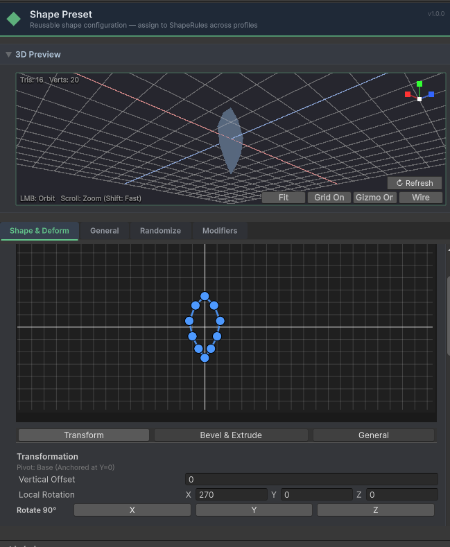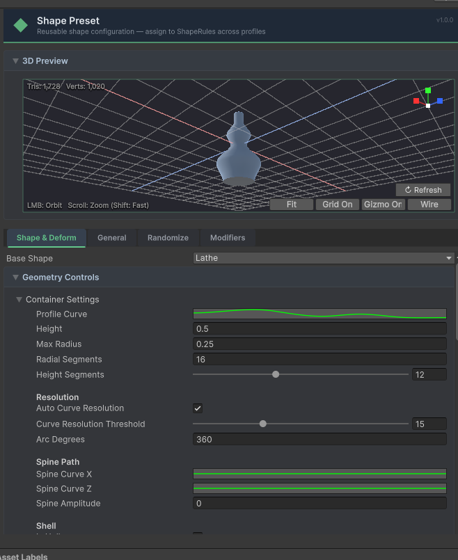 Assets > Create > PileGen > Lathe Profile(orMeshGen > Container Settings) - •Edit the Profile Points — each point defines (radius, height)